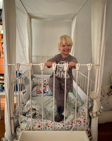 "¿A que no adivinan a quién encontré tratando de escapar de su cama? Es la cuna que le regaló la tía Su (Susana Giménez), pero ya pronto pasaremos a cama", contó el conductor en una publicación donde se ve a Mirko divertido intentando escapar de los barrotes que lo protegen de caídas.