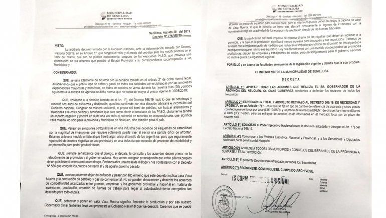 El intendente enfatizó el rechazo al artículo primero del DNU que congela el valor y el precio del petróleo ante las modificaciones en el valor del mismo. Consideró que "la medida tomada por el Gobierno nacional preocupa no sólo a Senillosa sino a todos los municipios de la Provincia".