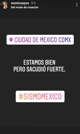 Lo primero que quiso transmitir Mónica Ayos fue que tanto ella como su marido e hijos se encontraban bien. "Ciudad de México CDMX: Estamos bien pero sacudió fuerte", escribió la actriz en sus historias de Instagram.