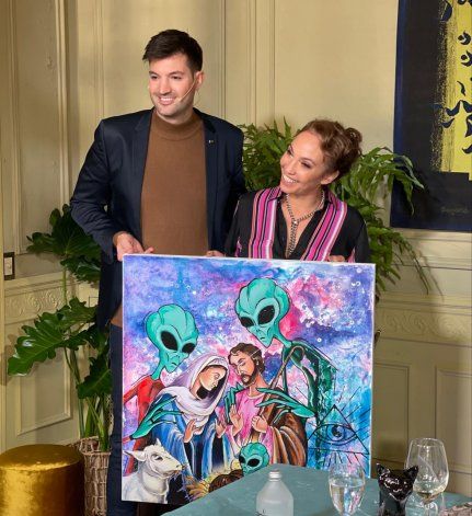 Para su participación en este programa, el artista llevó de regalo un cuadro especialmente realizado para la conductora. “Ella es muy controversial, especial y por eso pensé en un cuadro fuerte, con extraterrestres y más detalles”, describió el artista.