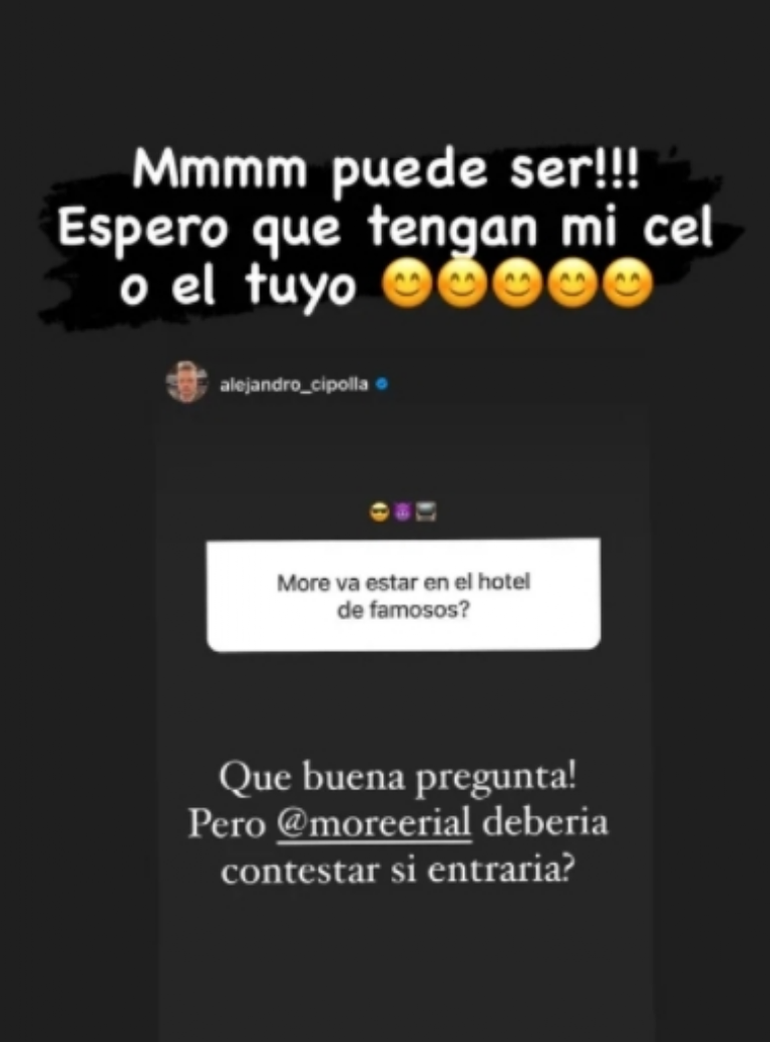 Luego, al ponerse al tanto sobre esa inquietud por parte de los usuarios de las redes sociales, la propia More Rial se expresó al respcto: "¡¡¡Mmmm puede ser!!! Espero que tengan mi celular o el tuyo", escribió la hija de Jorge Rial, dejando en claro que está abierta a la posibilidad de ser convocada.