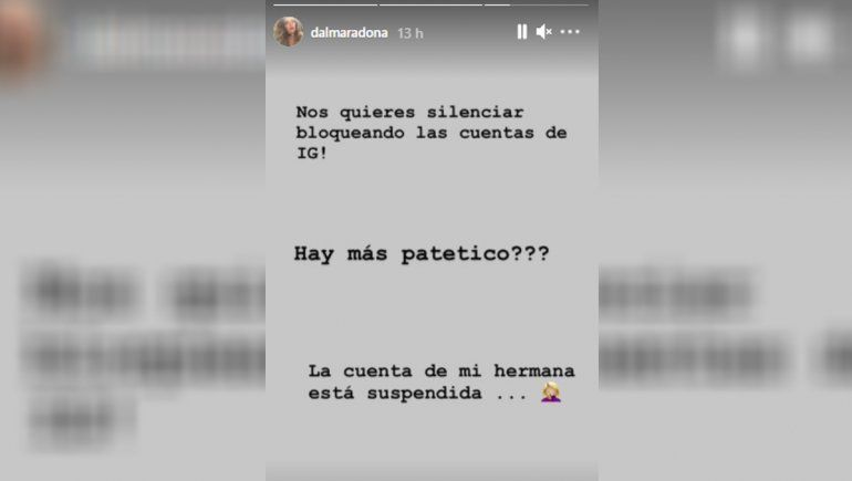 Sin embargo, Dalma disparó otra hipótesis, añadiendo más leña al fuego: “Nos quieren silenciar bloqueando las cuentas de IG! Hay más patético?? La cuenta de mi hermana está suspendida”, escribió en su Instagram.