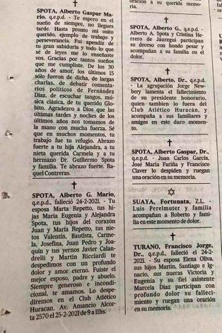 "SPOTA, Alberto G. Mario, q.e.p.d., falleció 24-2-2021. Tu esposa Marta Repetto, tus hijas María Eugenia y Alejandra Spota, tus hijos del corazón Juan y María Repetto, tus nietos Valentín, Bautista, Carmela, Josefina, Juan Pedro y Joaquín y tus yernos Javier Calandrelli y Martín Ricciardi te despedimos con un profundo dolor y amor eterno. Fuiste el mejor esposo, padre y abuelo. Siempre generoso e incondicional, te amamos. Lo despediremos en el Club Atlético Huracán, Av. Amancio Alcorta 2570 el 25-2-2021 de 9 a 11hs", fue la despedida que le dejó su esposa en el diario La Nación.