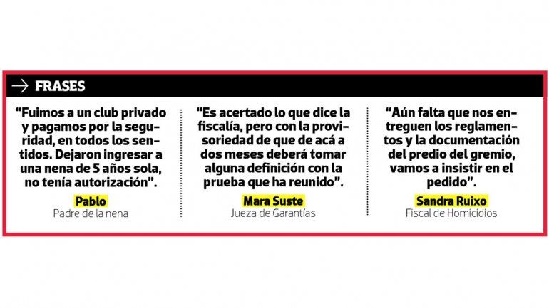 “Quien encontró a mi hija ahogada diez minutos después fue el cuidacoches del predio. Los dos guardavidas se encargaron de hacer la parte administrativa de controlar que los chicos tuvieran la pulsera para poder entrar”, contó el padre, y agregó: “Mi nena entró y se cayó en la pileta de los adultos, que tiene 1,60 metros de profundidad. Las piletas no están señalizadas de forma adecuada, se puede acceder porque están comunicadas dentro del perímetro enrejado”.