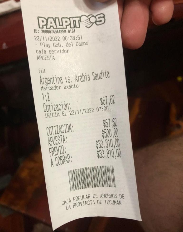 Según informó el medio El Tucumano, todo sucedió en una agencia de Pálpitos Deportivos de la avenida Gobernador del Campo, de la capital provincial y en el transcurso del partido se dio tal como lo predijo ese ticket ganador para la persona más feliz de la provincia: gol de Argentina, goles anulados, dos goles de Arabia, resultado final exacto.