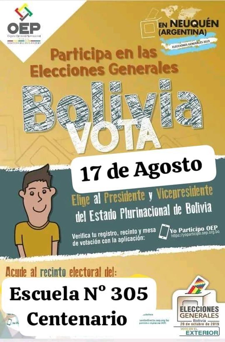La colectividad boliviana Simón Bolívar, informó que todos los ciudadanos empadronados están convocados a participar y ejercer su derecho al voto. Las elecciones se realizarán en el recinto escolar N° 305, ubicado en la localidad de Centenario.