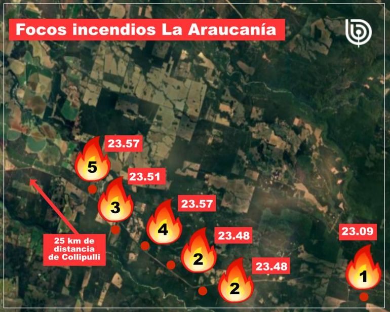 El primer foco de incendio registrado en la zona ocurrió a las 23:09 horas del sábado en San Luis-Jauja, a 45 kilómetros al este de Collipulli, afectando una superficie de 6 hectáreas. Este siniestro ya ha sido contenido. Sin embargo, la emergencia no terminó ahí, ya que a las 23:48, se reportaron dos nuevos focos en El Raulí, a 29 kilómetros al este de Collipulli, donde el fuego arrasó con 15 hectáreas.