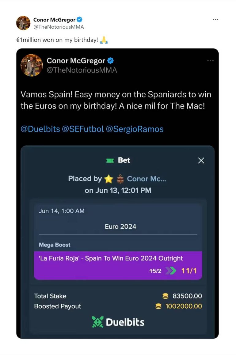 La Copa América y Eurocopa además de hacer felices a argentinos y españoles, flamantes campeones, también hizo feliz y (más) millonario al reconocido luchador Conor McGregor, que ganó una fortuna luego de apostar por Argentina y España. El luchador irlandés le tuvo fe a la Scaloneta y recibió la recompensa. Apostó una suma considerable por Argentina y España, ganador de la Eurocopa.