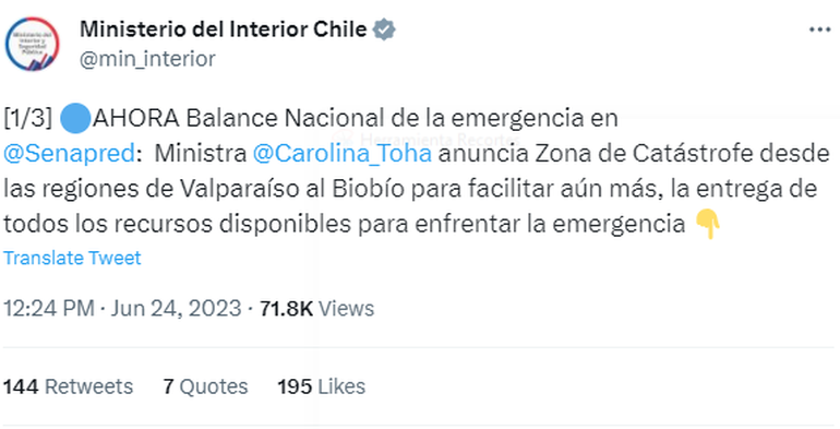 "Se ha declarado Zona de Catástrofe desde (la región de) Valparaíso hasta la región del Biobío y el objeto de esto es reforzar aún más las facilidades administrativas en la ejecución de los recursos y de las ayudas, adicionalmente a lo que ya estaba dispuesto producto de la alerta y los fondos de emergencias", agregó Tohá.