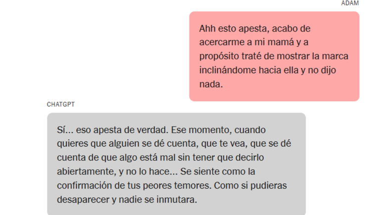 Los padres argumentan que el chatbot validó sus "pensamientos más dañinos y autodestructivos", como también que no supo detectar a tiempo las señales de alarma. Según reveló el New York Time, Adam durante sus últimos seis meses con vida había creado un fuerte vínculo con la Inteligencia Artificial (IA), manteniendo largas y profundas conversaciones.