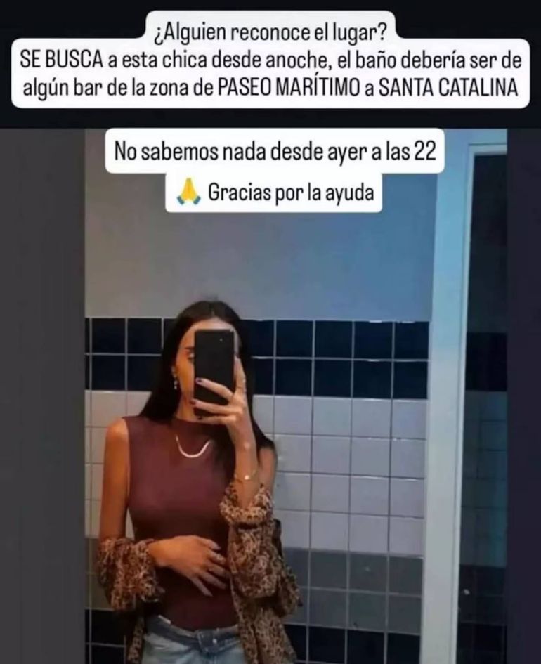 En medio de la incertidumbre, familiares de la joven desaparecida viralizaron la última imagen que se conoce de Agostina, una foto tomada el 2 de octubre en el baño de un local que podría estar en Santa Catalina o el Paseo Marítimo. En ese lugar, que ahora intentan ubicar, fue donde se le perdió el rastro.