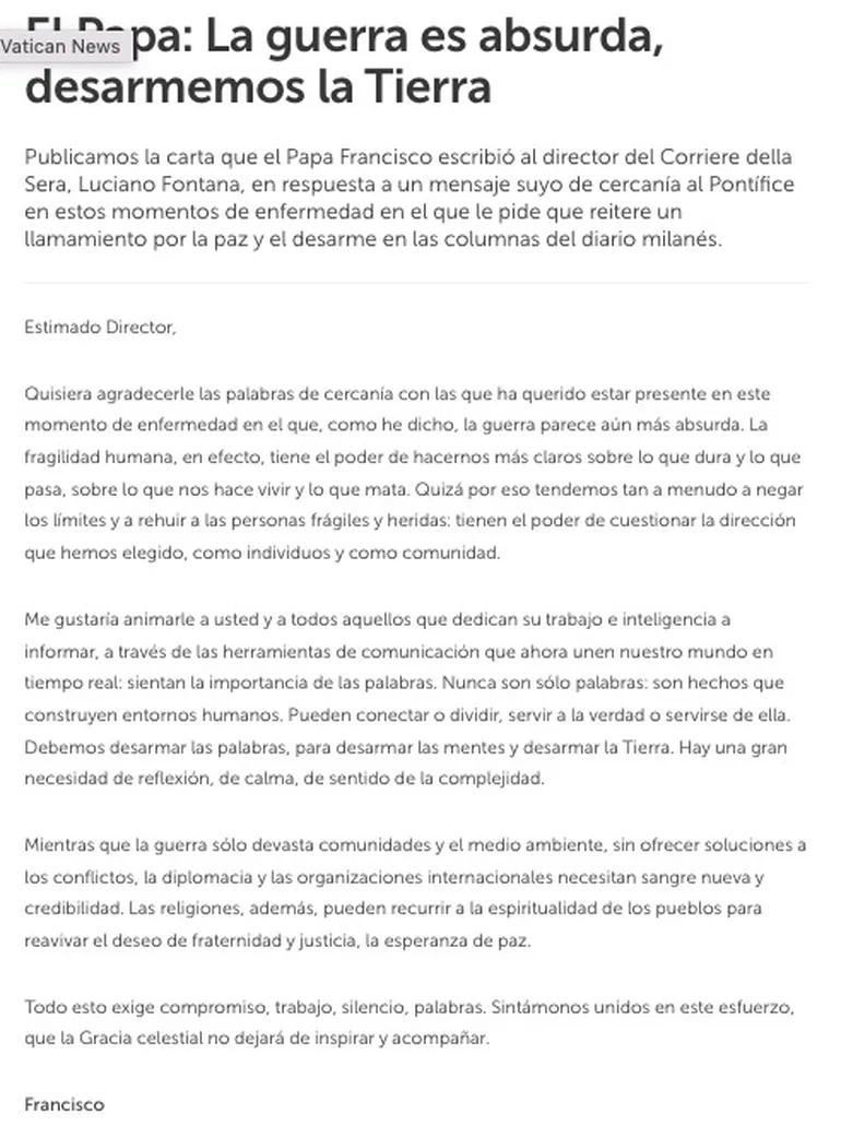 Durante su internación, el Santo Padre pasó momentos críticos, pero ya con una notoria mejoría, el Pontífice envió una carta al director del diario italiano Corriere della Sera donde agradece las palabras de apoyo a toda la comunidad y se tomó la oportunidad para reflexionar sobre la guerra y la necesidad urgente de que termine.