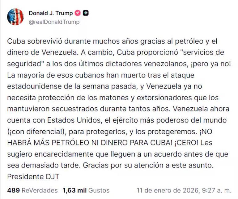 Y añadió: “La mayoría de esos cubanos murieron tras el ataque estadounidense de la semana pasada, y Venezuela ya no necesita protección de los matones y extorsionadores que los mantuvieron secuestrados durante tantos años. Venezuela ahora cuenta con Estados Unidos, el ejército más poderoso del mundo (¡con diferencia!), para protegerlos, y los protegeremos".