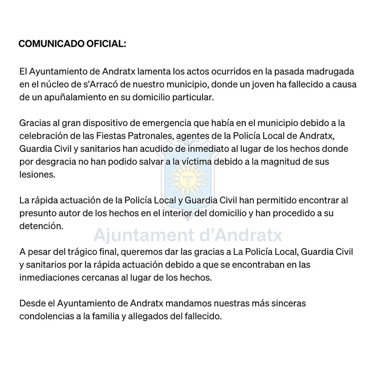 Al respecto, el Ayuntamiento de Andratx publicó un comunicado en el cual lamentó “los actos ocurridos en la pasada madrugada en el núcleo de s’Arracó (…) donde un joven ha fallecido a causa de un apuñalamiento en su domicilio particular”.