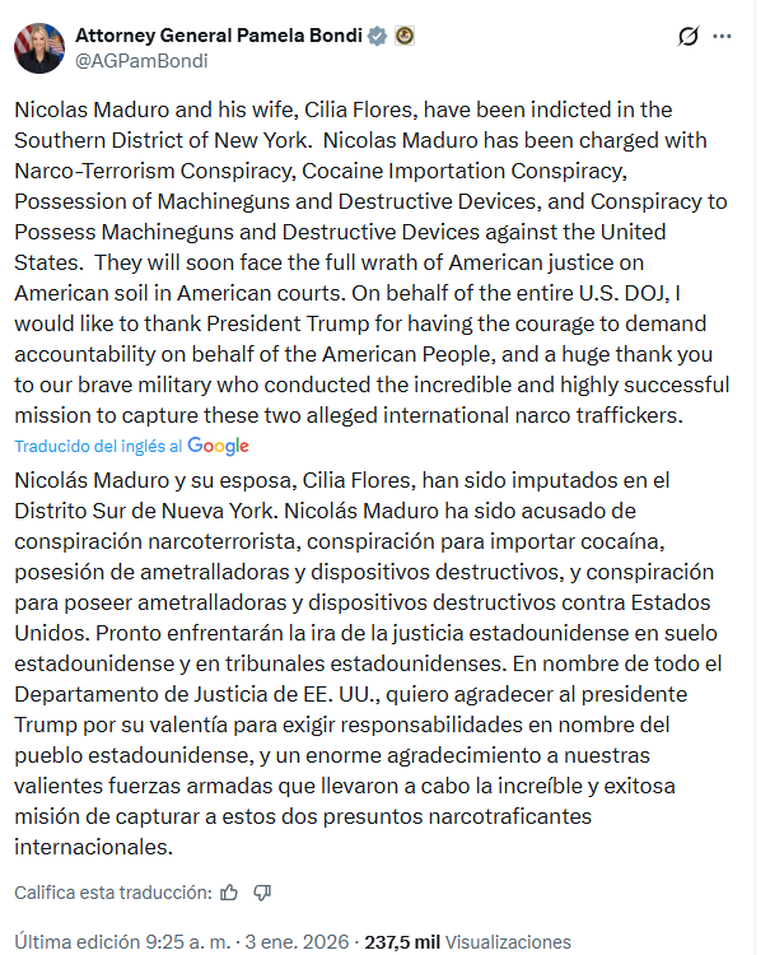 Bondi agradeció públicamente al presidente Donald Trump por su "coraje" al exigir rendición de cuentas y elogió la labor de los militares que llevaron a cabo la misión de captura en la madrugada de este sábado.