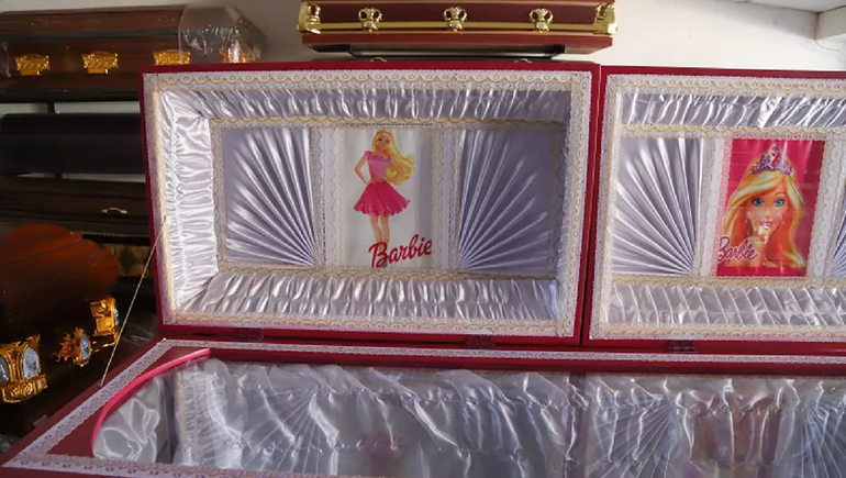 Villegas montó una campaña en las redes sociales para promocionar los ataúdes con el tradicional rosa de la famosa muñeca y adornados con estrellas de color blanco.
