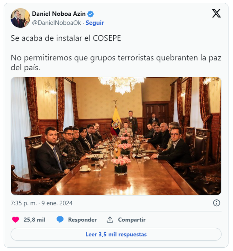 El Consejo de Seguridad Pública y del Estado se dio cita en Palacio de Carondelet. Esta reunión extraordinaria es encabezada por el mandatario nacional y cuenta con la participación de los titulares de los tres poderes del Estado. "No permitiremos que grupos terroristas quebranten la paz del país", sentenció en su cuenta de X (antes Twitter), Noboa.