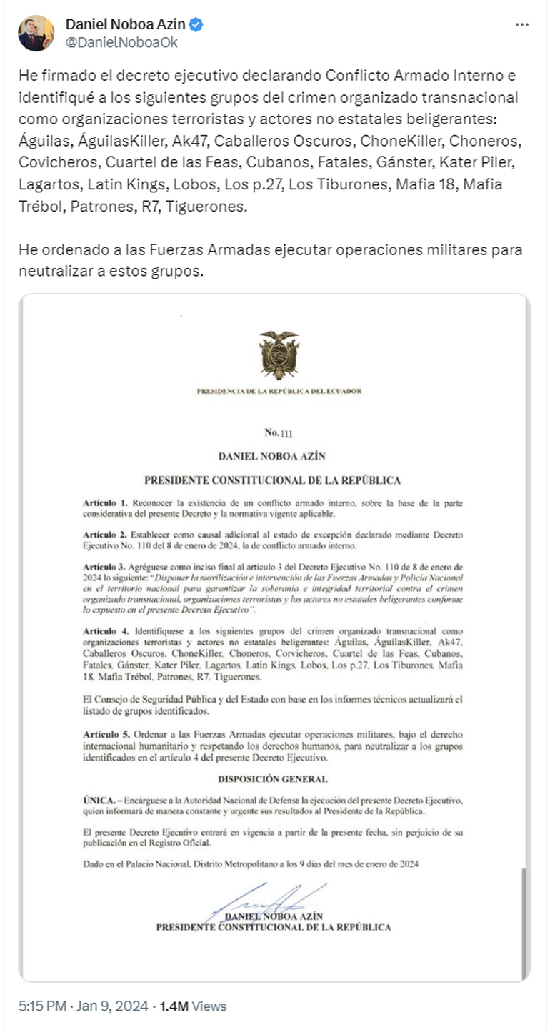 En un decreto publicado el martes por la tarde, el Presidente Daniel Noboa dijo que reconocía la existencia de un "conflicto armado interno" en Ecuador y declaró a 22 bandas criminales como "organizaciones terroristas". El decreto también ordenaba a las Fuerzas Armadas "neutralizar" a los grupos.