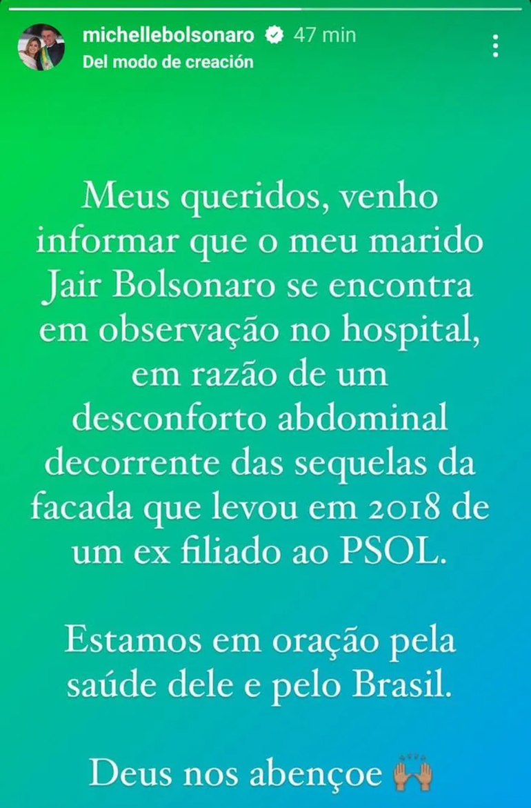 Fue a través de una historia de Instagram en la que Michelle Bolsonaro pidió al pueblo brasileño que recen por su marido. “Estimados, vengo a informarles que mi esposo Jair Bolsonaro se encuentra en observación en el hospital, debido a molestias abdominales producto del apuñalamiento que sufrió en 2018 por parte de un exmiembro del PSOL. Estamos orando por su salud y por Brasil. Dios nos bendiga”, publicó.