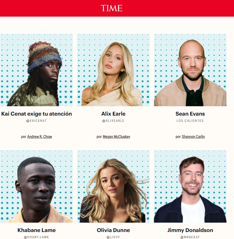 A su vez, TIME indicó que este proceso de selección "influencers" fue dirigido por la periodista Lucy Feldman junto a corresponsales y editores de la revista, contó con el análisis de la firma #paid, especializada en economía de creadores, que aportó métricas sobre alcance, engagement e impacto comercial.