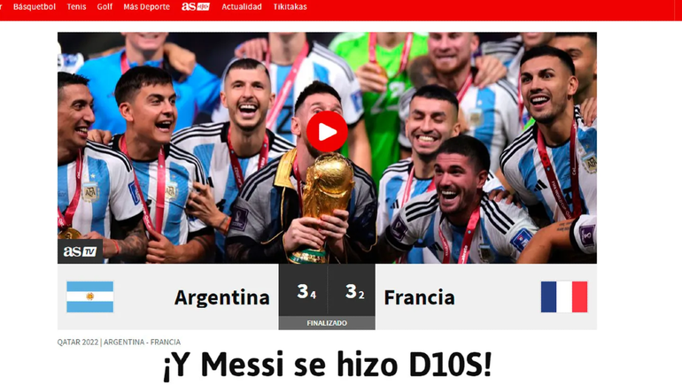 La Gazzetta dello Sport de Italia optó por titular: "Argentina campeona del mundo: Messi como Maradona. Francia eliminada en los penales". Mientras que As de España publicó: "¡Y Messi se hizo D10S! Argentina conquistó el Mundial en los penaltis tras un final épico y una batalla para la historia entre él y Mbappé. Coman y Tchouameni fallaron sus tiros. Tercera estrella para Argentina".
