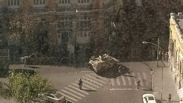 La televisión de ese país captó el momento en que, a bordo de un tanque de guerra, la fuerza militar forzó la puerta del Palacio del Quemado y el ingreso posterior de los oficiales al edificio.
