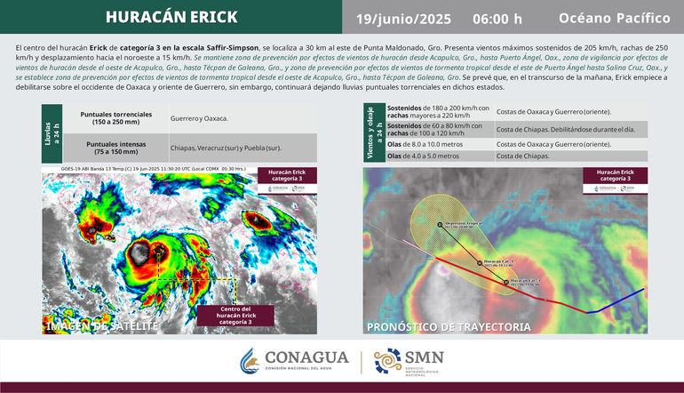 Tras el fuerte alcance que se produjo entre la madrugada y el transcurso de la mañana, el huracán Erick comenzó a debilitarse y se degradó a categoría 1. Su centro de localizó en tierra aproximadamente a 50 kilómetros al nornoroeste de Punta Maldonado, Guerrero, con vientos máximos sostenidos de 140 kilómetros por hora y rachas de 165 km/h, informó la Comisión Nacional del Agua.