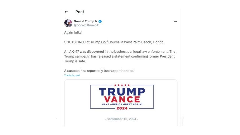 Por su parte, su hijo Donald Trump Jr. fue quien confirmó el incidente mediante sus redes sociales. "¡Una vez más, amigos! DISPAROS en el campo de golf Trump en West Palm Beach, Florida. Según las autoridades locales, se descubrió un rifle AK-47 entre los arbustos. La campaña de Trump publicó un comunicado en el que confirma que el expresidente Trump está a salvo. Según informes, se ha detenido a un sospechoso".