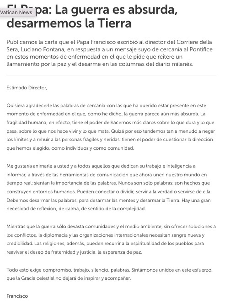 Ahora, con una leve mejoría, el Pontífice envió una carta al director del diario italiano Corriere della Sera donde agradece las palabras de apoyo a toda la comunidad y se tomó la oportunidad para reflexionar sobre la guerra y la necesidad urgente de que termine.