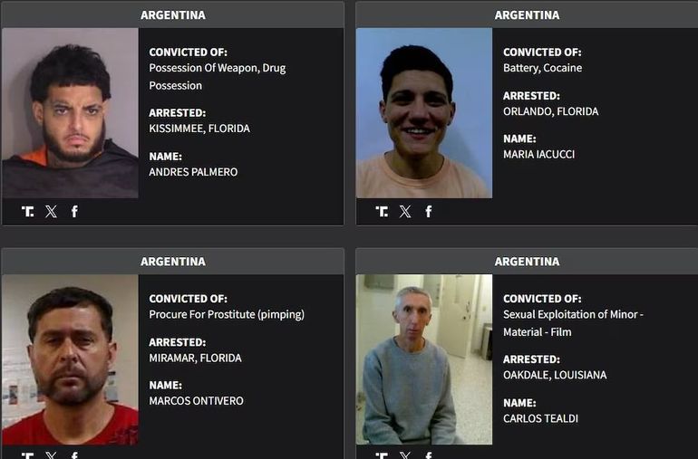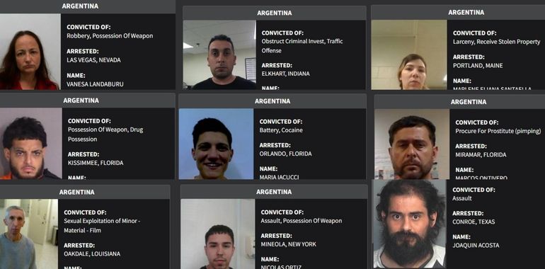 Los ciudadanos argentinos fueron identificados con nombre y apellido, foto de sus rostros, lugar de detención y el cargo por el que se los acusa. Los delitos van desde infracciones de tránsito hasta robo, posesión de armas, de drogas y explotación sexual de menores, con arrestos en estados como Nevada, Nueva York y Louisiana.