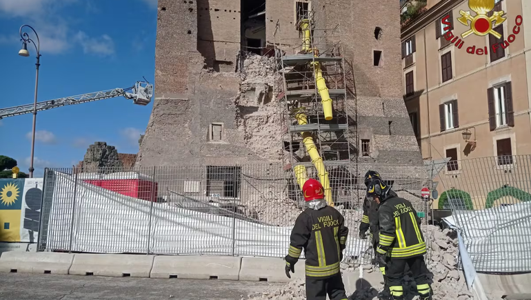 Una parte de la Torre dei Conti, una histórica construcción medieval situada en el centro de Roma en Italia, cerca de los Foros Imperiales, se derrumbó este lunes mientras se realizaban trabajos de restauración, lo que obligó a los bomberos a rescatar a cuatro operarios, uno de ellos en estado grave.