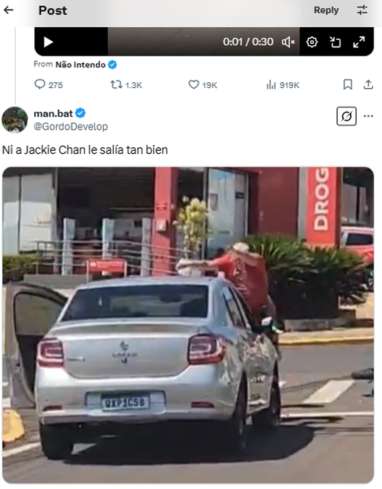Una feroz pelea se desató en las calles de Presidente Prudente, en Brasil, cuando el conductor de un Renault Logan se vio envuelto a las piñas con un hombre que circulaba en moto.
