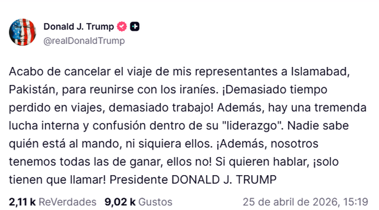 La confirmación llegó a través de un mensaje del propio Donald Trump en sus redes sociales, donde anunció la cancelación del viaje a Islamabad. “Acabo de cancelar el viaje de mis representantes a Islamabad, Pakistán, para reunirse con los iraníes. Demasiado tiempo perdido en viajes, demasiado trabajo”, escribió.