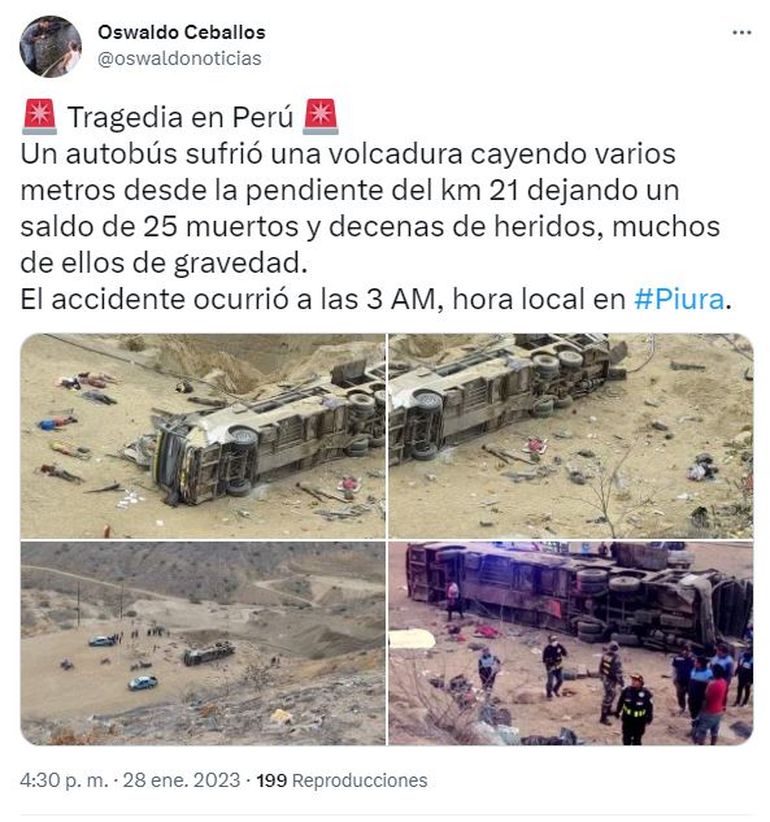 El vehículo perteneciente a la empresa Q'orianka Tours partió desde Lima y se dirigía hacia Tumbes, en la frontera con Ecuador, pero unos 260 kilómetros para llegar al destino salió de la ruta en un área desértica de la localidad de Órganos, minutos antes de las 6 de la mañana, indicó la agencia de noticias AFP.