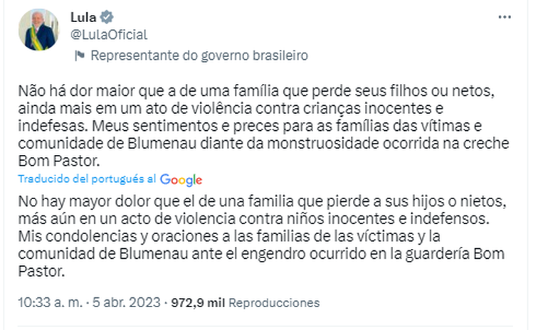 El presidente brasileño Lula da Silva afirmó que la masacre fue “una tragedia inaceptable”, una “monstruosidad” y un “acto absurdo de odio y cobardía. No hay mayor dolor que el de una familia que pierde a sus hijos o nietos, más aún en un acto de violencia contra niños inocentes e indefensos. Mis condolencias y oraciones para las familias de las víctimas y la comunidad de Blumenau ante la monstruosidad ocurrida en la guardería Bom Pastor”, escribió el mandatario en las redes sociales.