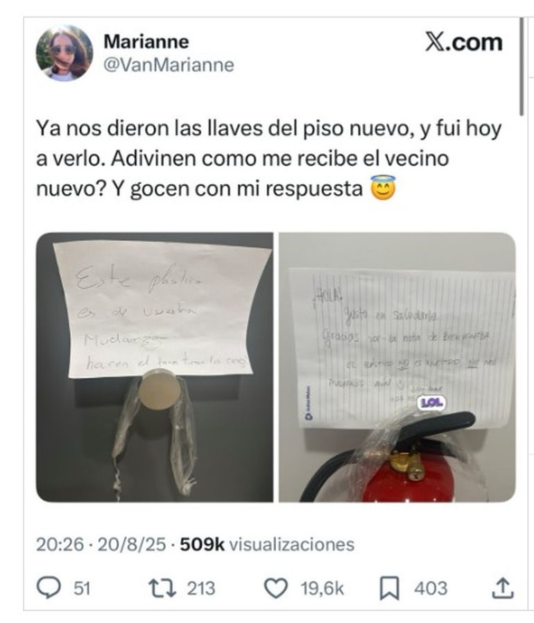 El posteo, acompañado por fotos de ambos carteles, acumuló en pocas horas más de 2,5 millones de visualizaciones y superó los 75 mil “me gusta”. El contraste entre la expectativa de una mudanza y el choque con un vecino que inicia la relación con un reproche encendió el debate digital.
