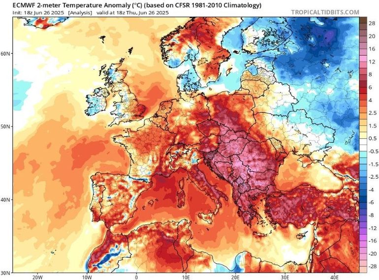 En el caso de España, varias zonas del interior como Andalucía, Galicia y Madrid se encuentran bajo alerta naranja. Pocas zonas cuenta con una alerta amarilla y esta situación se prolongará como mínimo hasta mañana martes, de acuerdo con la Agencia Estatal de Meteorología (AEMET). Este organismo advierte de que junio batirá un nuevo récord y se convertirá en el mes más caluroso desde que se tienen registros.