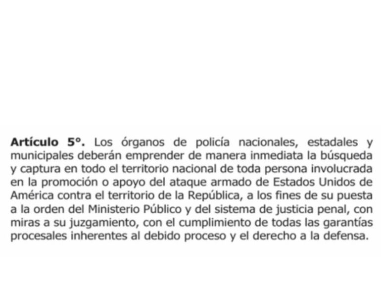 “Los órganos de policía nacionales, estadales y municipales deberán emprender de manera inmediata la búsqueda y captura en todo el territorio nacional de toda persona involucrada en la promoción o apoyo del ataque armado de Estados Unidos”, expresa el documento.
