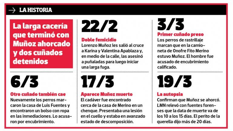 Neuquén.- Mientras se aguarda el informe preliminar de autopsia que se dará a conocer el lunes y en el que se podría llegar a confirmar la data de muerte del femicida Lorenzo Muñoz, trascendió un dato para avanzar en la causa por encubrimiento: Muñoz se cambió la ropa luego de matar a Karina y Valentina. El dato fue relevado por LMN a partir de informes oficiales.