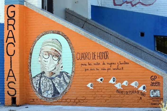 “Cuadro de honor para les miles de hombres y mujeres que dan la vida por nosotros”, escribieron las muralistas para acompañar el rostro de una trabajadora de salud con sus elementos de protección. La obra fue realizada con la técnica del trencadis que consiste en pegar pequeños fragmentos de cerámico, vidrio u otro material como si fuera un rompecabezas.