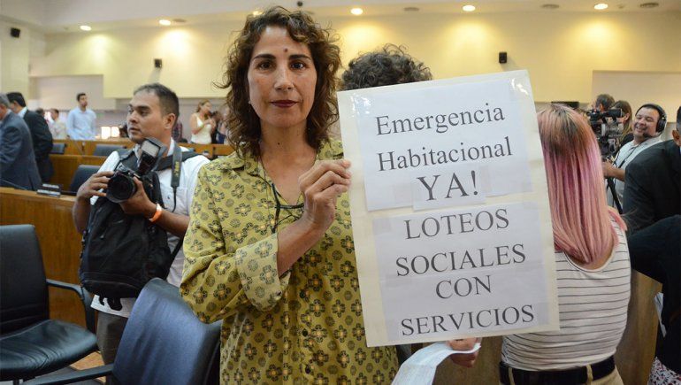 Cuando subió al estrado, las concejales de la izquierda levantaron en alto carteles que exigían la declaración de una emergencia habitacional y la provisión de loteos sociales para las familias neuquinas, en el marco del clima candente que generó en la ciudad el crecimiento de una toma de terrenos sobre la Autovía Norte.