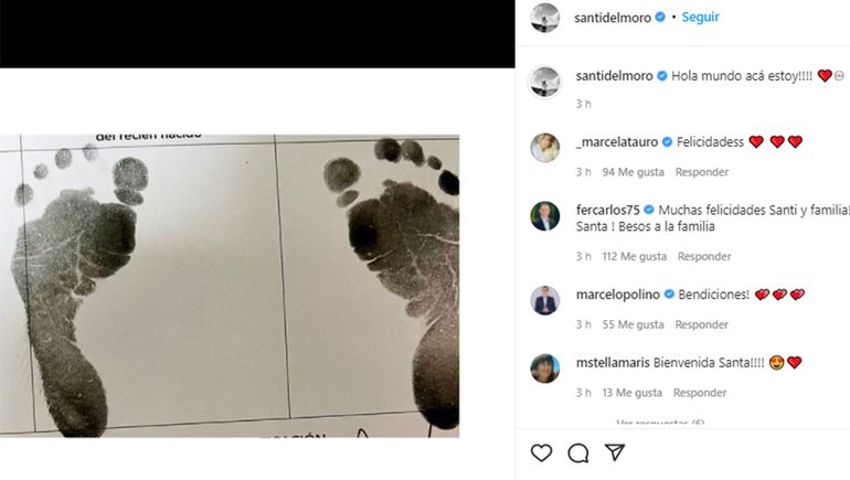 “Hola mundo, acá estoy”, expresó con felicidad. Además, en una historia, Del Moro contó que la beba pesó 3.020 kg.