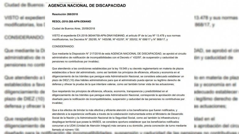 El gobierno nacional publicó en el Boletín Oficial la resolución 268/2018 de la Agencia Nacional de Discapacidad, donde señaló que "mediante la Disposición Nº 217/2018 de esta Agencia Nacional de Discapacidad, se aprobó el circuito administrativo de notificación de incompatibilidades con el Decreto Nº 432/97, de suspensión y caducidad de pensiones no contributivas por invalidez".