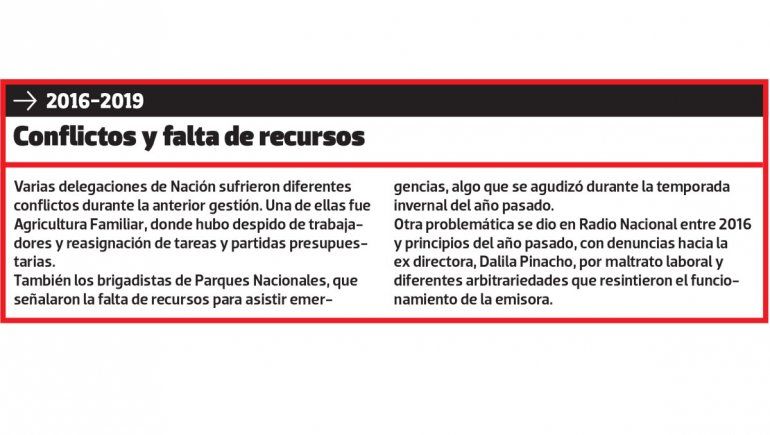 Tampoco tienen nuevos titulares las otras delegaciones, como la Superintendencia de Riesgo de Trabajo, la Superintendencia de Salud, la Aduana, el Inta, Senasa, Parques Nacionales, la AIC, Migraciones, la Oficina Nacional de Control Comercial Agropecuario (ONCCA) y el Correo. También hay áreas de Nación que no funcionan con estructuras pero que deben designar delegados y jefes, como Vivienda, Educación y Cultura, que funcionan a través de programas que se desarrollan de manera directa con los municipios.