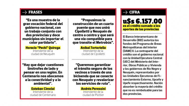 El nuevo puente vinculará las calles Leloir y Entre Ríos, frente al nuevo corredor inmobiliario neuquino, con la calle Mariano Moreno y la Ruta 151 en Cipolletti. También habrá un estudio de factibilidad para que haya y un Metrobús en esa vía de conexión interprovincial.