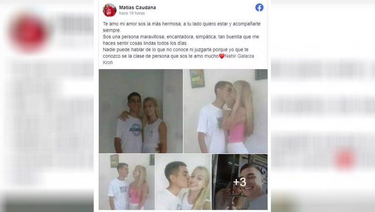 "Te amo mi amor sos la más hermosa, a tu lado quiero estar y acompañarte siempre. Sos una persona maravillosa, encantadora, simpática, tan buenita que me haces sentir cosas lindas todos los días. Nadie puede hablar de lo que no conoce ni juzgarte porque yo que te conozco se la clase de persona que sos te amo mucho Nahir Galarza Kroh", escribió en sus redes sociales y etiquetó a Nahir con una serie de fotos de los dos en Paraná.