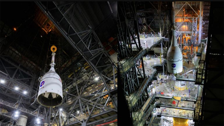 El miércoles pasado, la nave espacial Orión fue acoplada al potente cohete Space Launch System (SLS) en el Centro Espacial Kennedy de la NASA en Florida.