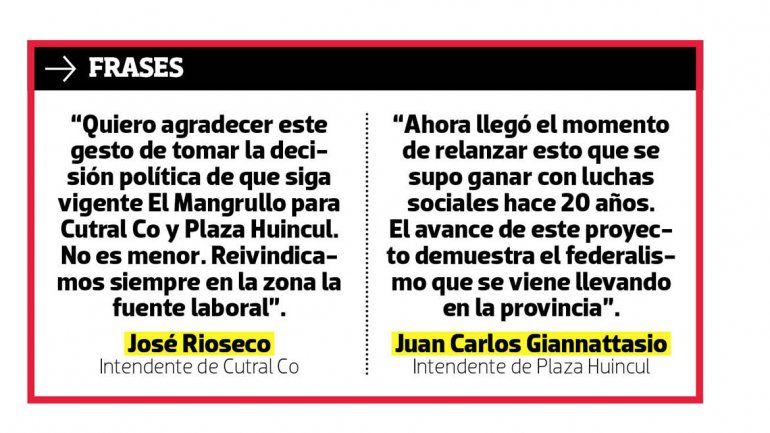 El gobernador agregó que la provincia reconoce “por completo, por los próximos 35 años, los derechos, el uso, la explotación de El Mangrullo al ENIM, al pueblo de Cutral Co y Plaza Huincul. El gobierno de la provincia no se va a quedar con un solo peso ni del bono, ni del programa de Responsabilidad Social Empresaria, ni de las regalías”.