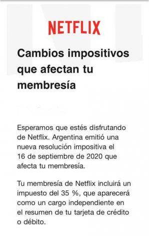Este viernes los usuarios argentinos de Netflix recibieron un correo electrónico cuyo asunto ya anticipa la cuestión: “Actualización de la cuenta: nuevo impuesto en Argentina”. "Argentina emitió una nueva resolución impositiva el 16 de septiembre de 2020 que afecta tu membresía", sostuvo Netflix a través de un mensaje enviado a sus clientes. Asimismo, la plataforma subrayó que la medida implementada por la entidad presidida por Miguel Pesce "es un cambio inesperado" y agrega que la suscripción “incluirá un impuesto del 35 %, que aparecerá como un cargo independiente en el resumen de tu tarjeta de crédito o débito”.