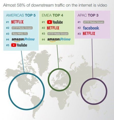 Mientras los videos son los reyes del tráfico en internet por estos días, concentrando el 57,69% del tráfico a nivel mundial; Netflix se posicionó en la delantera llevándose la porción más grande de la torta.